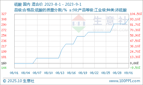 9月1日國內(nèi)硫酸市場價格大幅上漲,較8月31日價格上漲了18元/噸,漲幅6.12%,同比上漲23.81%。上游硫磺行情近期持續(xù)上漲,成本支撐增加。下游氫氟酸、鈦白粉市場行情小幅上漲,下游客戶對硫酸的采購積極性較好。多重利好,產(chǎn)品走勢上行。